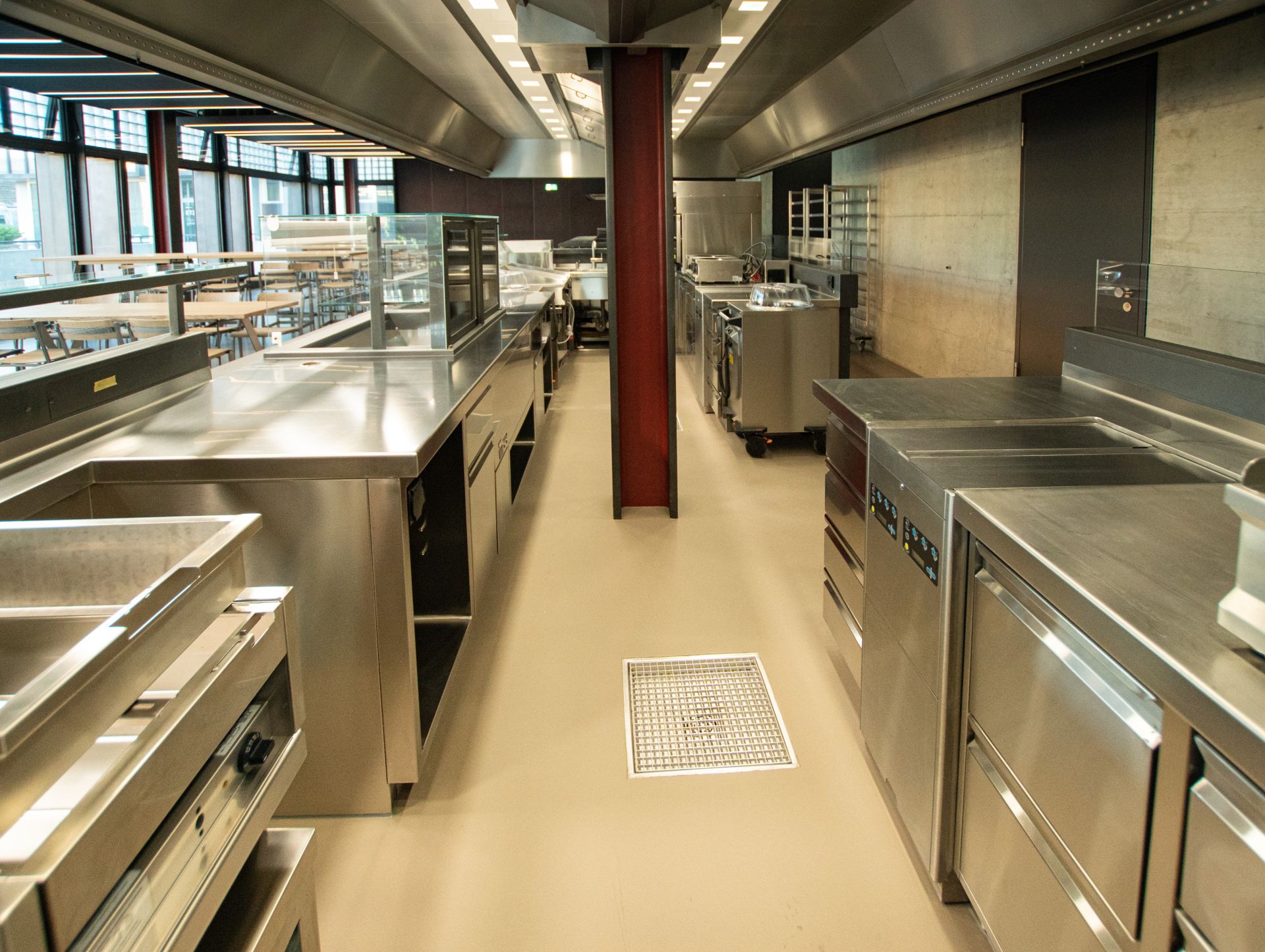Durch die sehr gut gewählte und prominente Lage im Gebäude, ist die Gastronomie Anziehungspunkt für die Gebäudenutzer. Das Restaurant wird von aussen wahrgenommen, wenn man seinen Blick auf das imposante Gebäude mit den Glasbausteinen wirft. Im Inneren passt sich die Gastronomie mit den gut gewählten Farben und Materialien optimal in die moderne Architektur ein. Die Thekenverkleidungen aus handgefertigtem beleuchteten Muranoglas sind ein besonderer Eyecatcher.