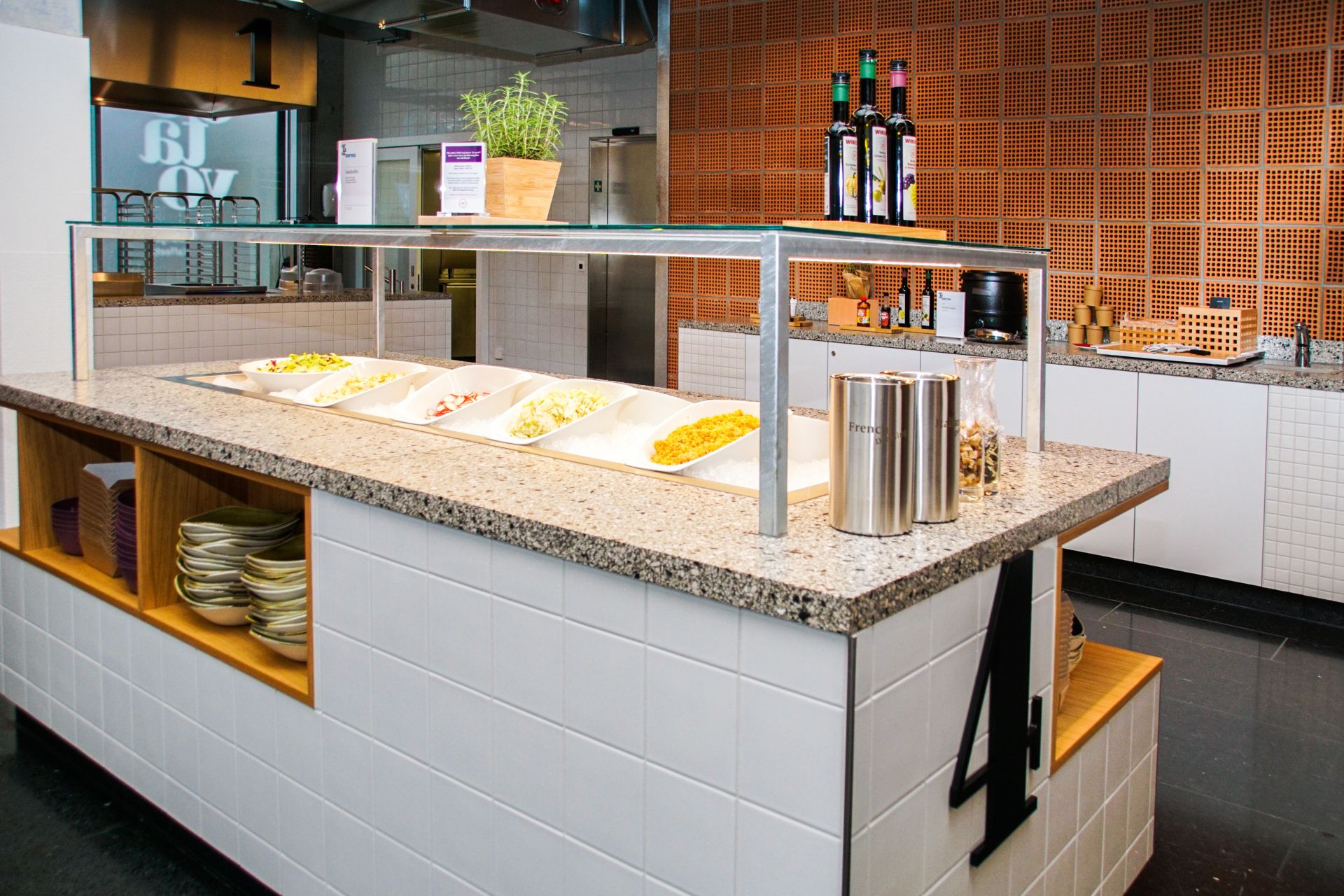Sämtliche rückwärtigen Gastronomieräume wurden komplett aus dem Bestand übernommen. Im Frontbereich hingegen wurde die Infrastruktur grosszügig erneuert. So finden sich hier nun ein Selbstbedienungsrestaurant im Free Flow System, wo neben dem klassischen Angebot an Schöpfmenüs auch direkt und frisch vor dem Gast gekocht wird. Zusätzlich stehen ein üppiges Salatbuffet und eine Suppentheke zur Auswahl. Die Infrastruktur ist so ausgelegt, dass jederzeit verschiedenen saisonale Themen zelebriert und umgesetzt werden können.