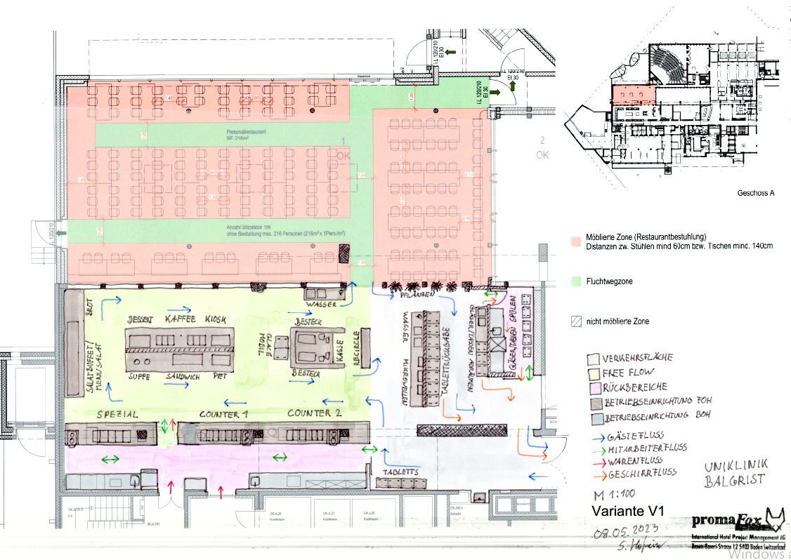 Die Machbarkeitsstudie zeigt auf, wie mit einer geschickten Umstrukturierung des Free-Flows und einer Angebotsanpassung, die Kapazität vergrössert und der Gästefluss verbessert werden kann. Dabei können bestehende Elemente teils übernommen werden und der Eingriff in die Architektur und die Haustechnik hält sich in Grenzen. Ein neuer separater Bereich für das Gläserspülen entlastet zusätzlich den Ausgabenbereich und reduziert Kreuzungspunkte. Des Weiteren wurde aufgezeigt, welchen zusätzlichen Flächenbedarf es bei der steigenden Anzahl an Verpflegungsteilnehmern im Gastraum in Zukunft geben wird. Mit der erarbeiteten Grobkostenschätzung und den technischen Indikatoren konnte dem Auftraggeber erläutert werden, was ein potentieller Umbau sowohl finanziell wie auch von Seiten Haustechnik bedeuten würde.