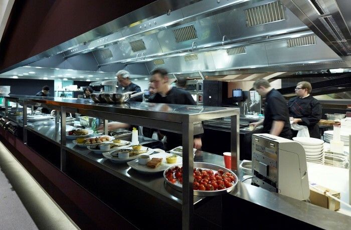 In der zum Gast geöffneten Küche ist der Grill das Herzstück. Die Grillstation wurde zusammen mit Fachspezialisten eigens entwickelt. Dabei galt es die speziellen Sicherheitsanforderungen des Flughafens Zürich beim Gebrauch eines Gasgrills zu berücksichtigen und Geruchsemissionen zu vermeiden.