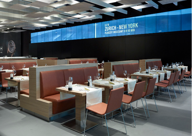 Den Auftraggebern war es wichtig, dass die Faszination des Fliegens eine wichtige Rolle spielt und der Innenarchitekt viele architektonische Elemente der Aviatik miteinfliessen lässt. Dies spürt man bereits beim Zugang zum Restaurant über eine extra gebaute Gang Way. Die spezielle Decken-konstruktion mit den Spanten über dem Gästebereich stellen den Rumpf eines Flugzeuges dar und die Deckensegel werfen Licht und Schatten auf den Boden. Die technisch sehr aufwändig geplante Medienwand mit rund 20 Screens und Flugsimulationen lässt den Gast in die Ferne schweifen.