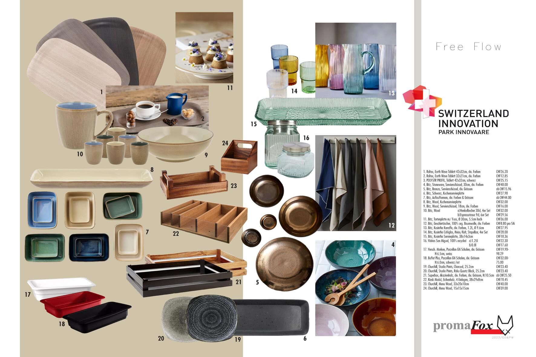 Wir haben für diese Aufgabe unser Team mit Penny Wedgewood Mehera verstärkt und konnten dank ihr und den Stärken unserer Mitarbeitenden die für die Bemusterung nötigen Moodboards erstellen. Dank dieser Moodboards konnten die Präferenzen der Bauherrschaft effizient abgeklärt und die entsprechende Ausschreibung getätigt werden. Die Beschaffung des Materials ist dank der Ausschreibung zu wirtschaftlich interessanten Konditionen umgesetzt worden. Das gesamte Table Top konnte rechtzeitig bis zur Eröffnung in Empfang genommen werden.