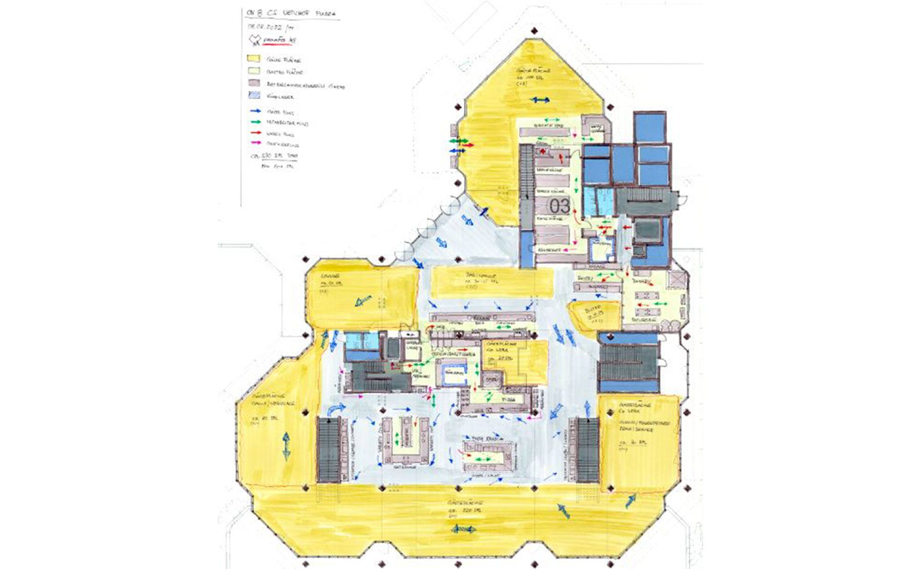 Die verschiedenen Gastronomieformate sind auf drei Hauptgebäude verteilt. Diese wiederum verfügen je über 12 Stockwerke. Die qualitätserhaltende Auslieferung der täglich 4000 Mahlzeiten an die unterschiedlichen Standorte aus einer Produktionsküche gehört zu den anspruchsvollsten Herausforderungen für den Planer sowie den Betreiber.