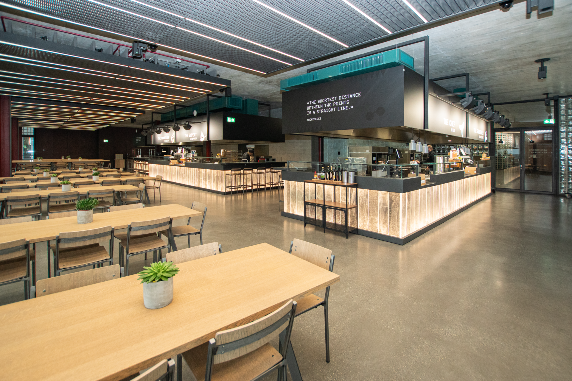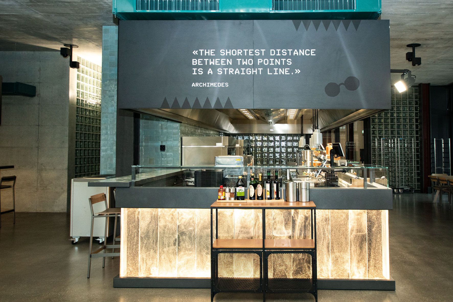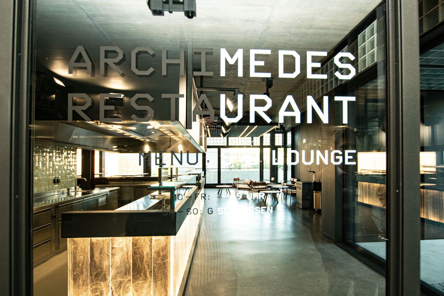 Durch die sehr gut gewählte und prominente Lage im Gebäude, ist die Gastronomie Anziehungspunkt für die Gebäudenutzer. Das Restaurant wird von aussen wahrgenommen, wenn man seinen Blick auf das imposante Gebäude mit den Glasbausteinen wirft. Im Inneren passt sich die Gastronomie mit den gut gewählten Farben und Materialien optimal in die moderne Architektur ein. Die Thekenverkleidungen aus handgefertigtem beleuchteten Muranoglas sind ein besonderer Eyecatcher.