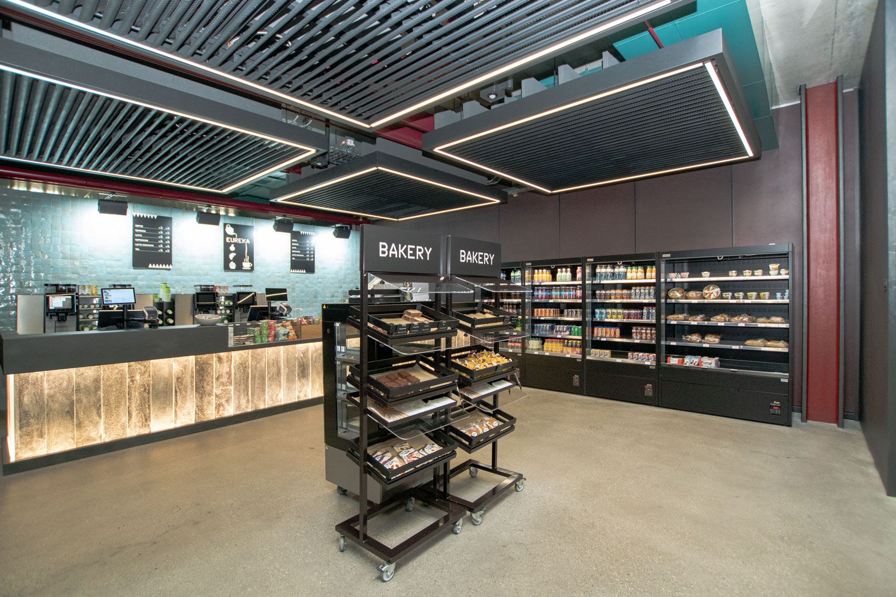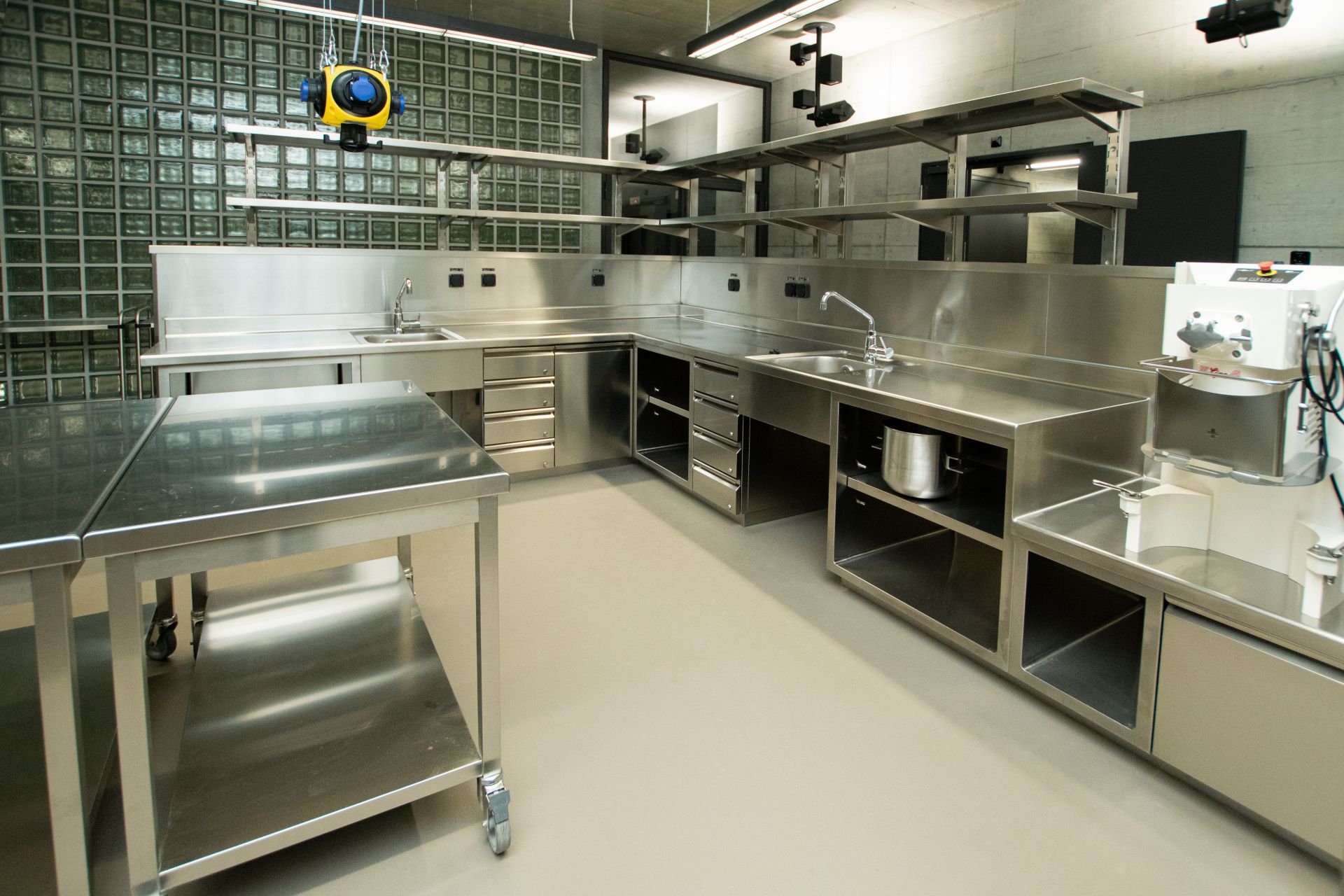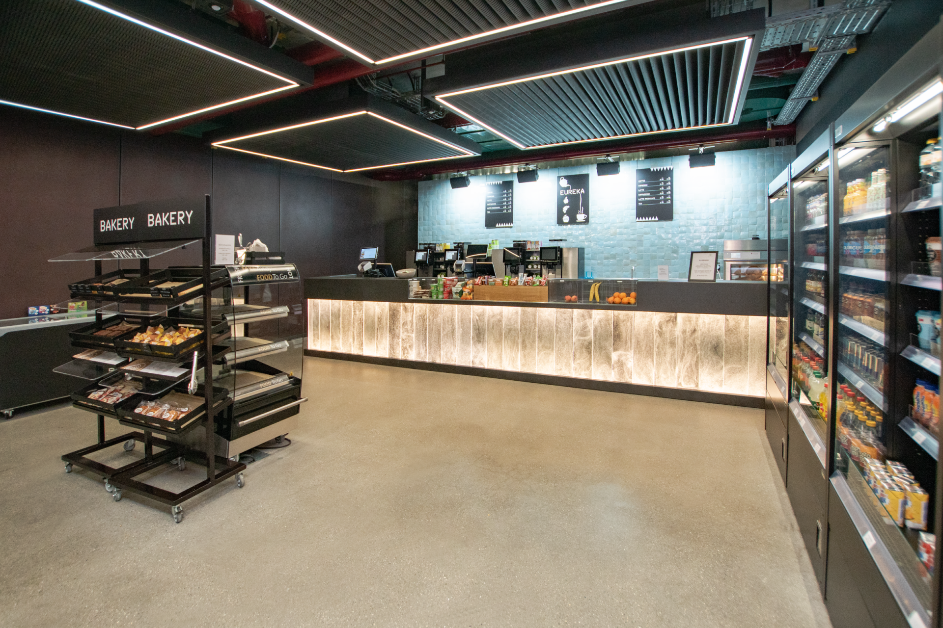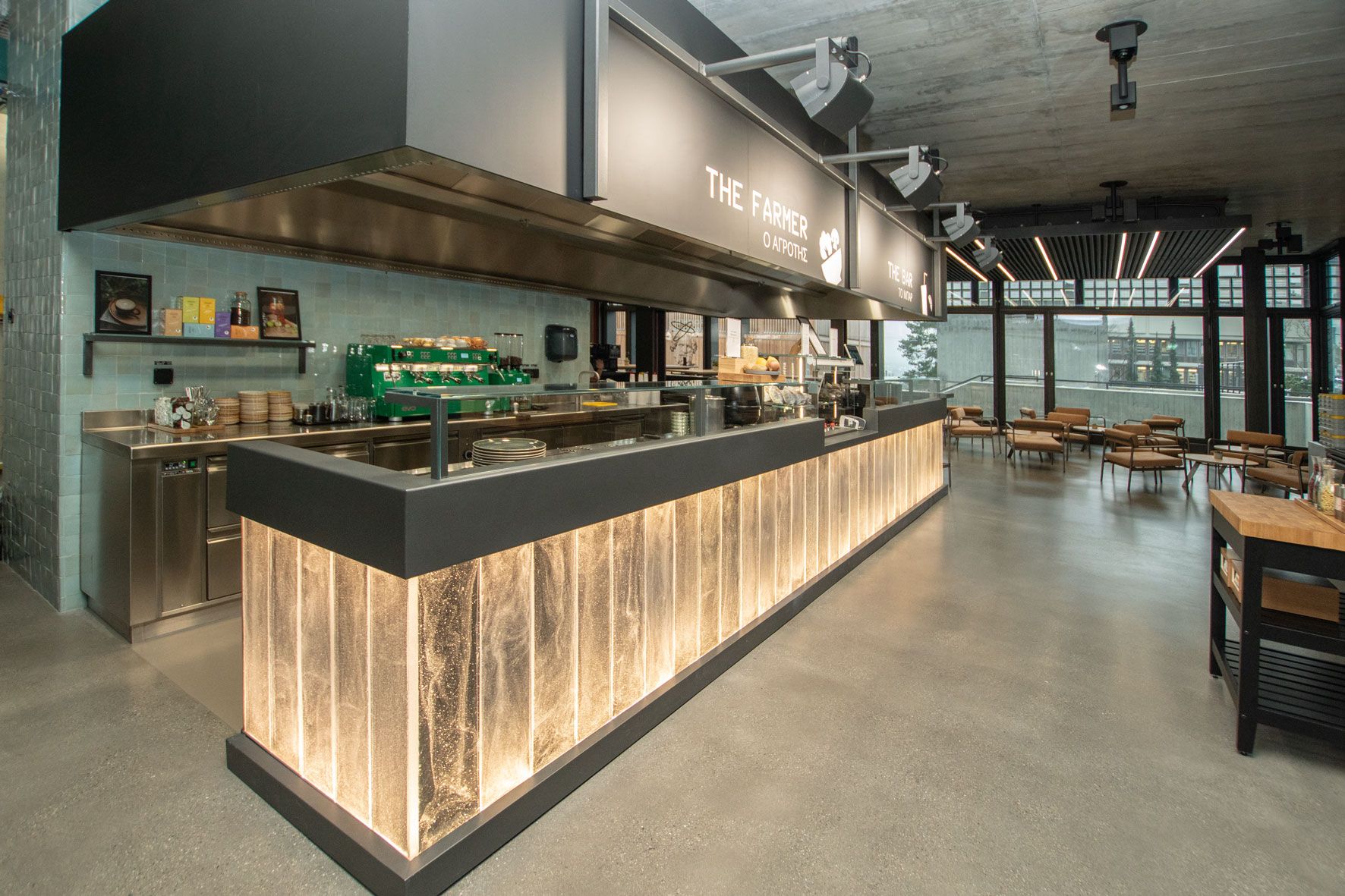 Durch die sehr gut gewählte und prominente Lage im Gebäude, ist die Gastronomie Anziehungspunkt für die Gebäudenutzer. Das Restaurant wird von aussen wahrgenommen, wenn man seinen Blick auf das imposante Gebäude mit den Glasbausteinen wirft. Im Inneren passt sich die Gastronomie mit den gut gewählten Farben und Materialien optimal in die moderne Architektur ein. Die Thekenverkleidungen aus handgefertigtem beleuchteten Muranoglas sind ein besonderer Eyecatcher.