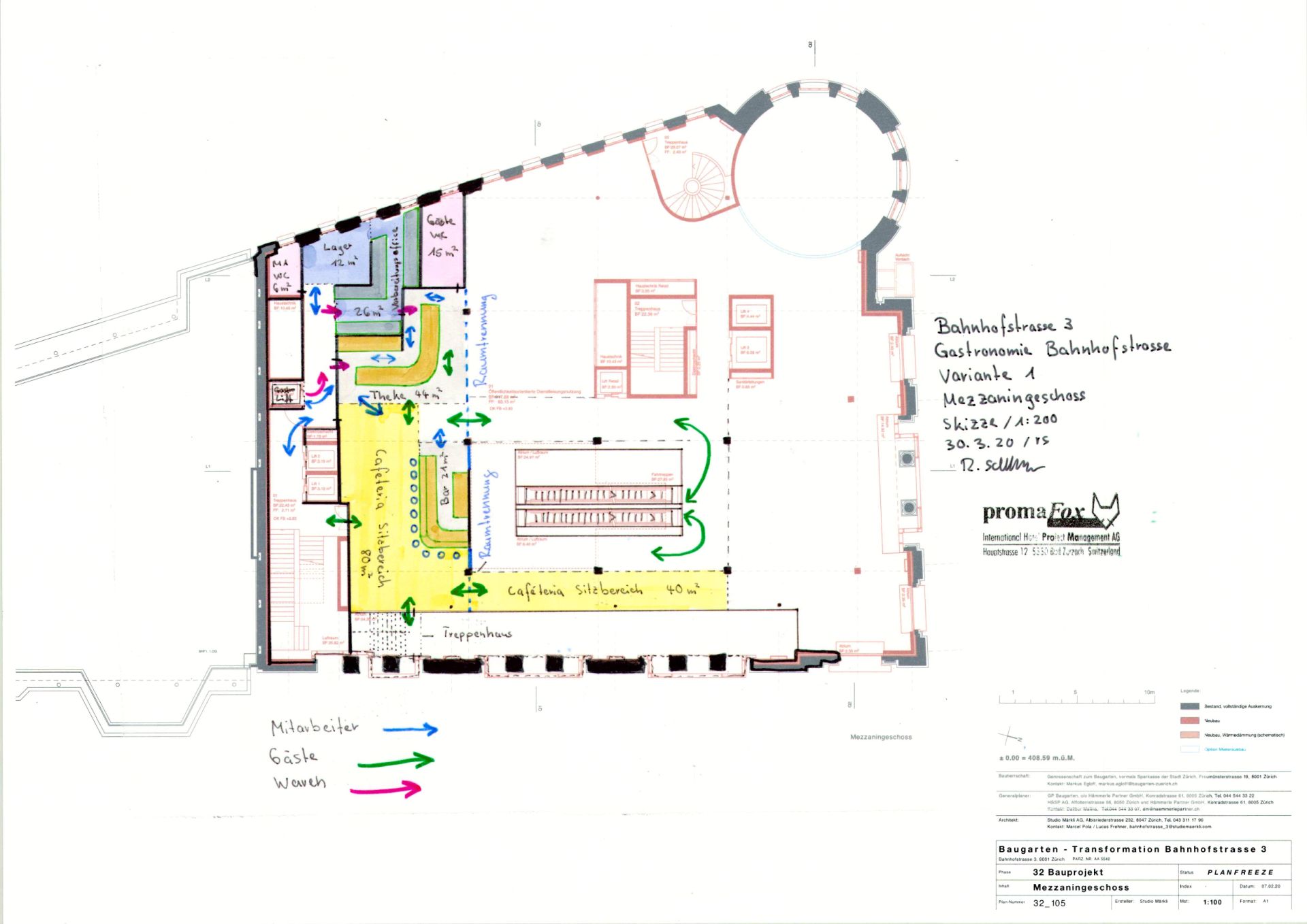 Die vorhanden Flächen und die entsprechenden Rahmenbedingungen wurden in einem konzeptionenellen Layout (Varianten) aufgezeigt. Jede dieser, von promaFox AG erarbeiteten Varianten, beleuchtete die jeweiligen Vor- und Nachteile. Ein spezielles Augenmerk wurde dabei auf die ökonomischen Erfolgschancen eines zukünftigen Betreibers gelegt. Daraus erfolgte die erfolgreiche Festlegung der Ausprägung, Grösse und Standort der Gastronomie innerhalb des Gebäudes.