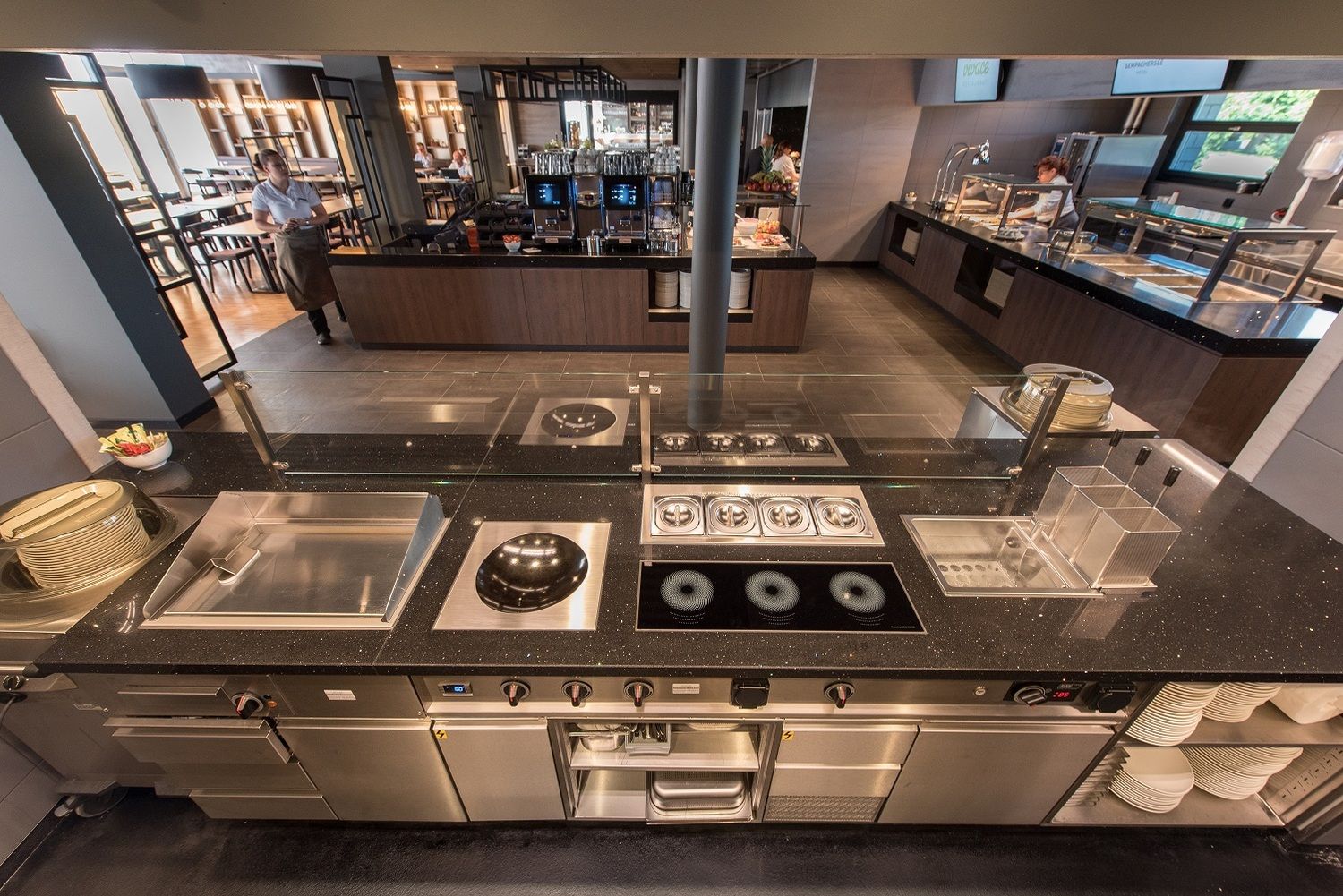Im 1. OG erwartet die Gäste das bediente Restaurant "Sempia" mit 100 Sitzplätzen und offener Showküche basierend auf dem Konzept von D&D Hospitality Projects GmbH. In stimmungsvollem Ambiete wählen die Gäste aus einem erlesenen und vielfältigen Speiseangebot serviert in Schalen und kombinieren ihre Lieblingsgerichte ganz nach ihren persönlichen Vorlieben. Als besonderes Highlight gelang die Kreation einer Herdanlage, welche Design-Aspekte des Gastraums mit der Küche vereint. Die Küche ist vom erhöhten Gastbereich komplett einsehbar und eignet sich für Teambuilding-Kochevents, als Kochstudio oder für weitere Aktivitäten zur Stützung des Kerngeschäfts.