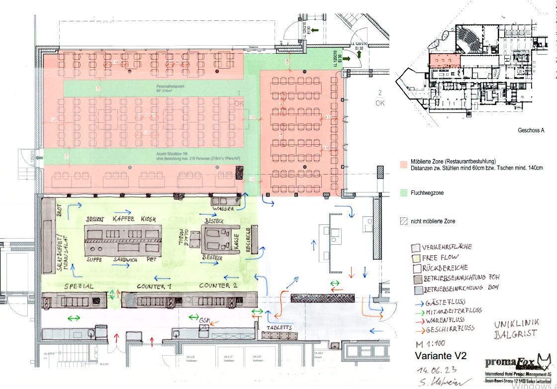 Die Machbarkeitsstudie zeigt auf, wie mit einer geschickten Umstrukturierung des Free-Flows und einer Angebotsanpassung, die Kapazität vergrössert und der Gästefluss verbessert werden kann. Dabei können bestehende Elemente teils übernommen werden und der Eingriff in die Architektur und die Haustechnik hält sich in Grenzen. Ein neuer separater Bereich für das Gläserspülen entlastet zusätzlich den Ausgabenbereich und reduziert Kreuzungspunkte. Des Weiteren wurde aufgezeigt, welchen zusätzlichen Flächenbedarf es bei der steigenden Anzahl an Verpflegungsteilnehmern im Gastraum in Zukunft geben wird. Mit der erarbeiteten Grobkostenschätzung und den technischen Indikatoren konnte dem Auftraggeber erläutert werden, was ein potentieller Umbau sowohl finanziell wie auch von Seiten Haustechnik bedeuten würde.