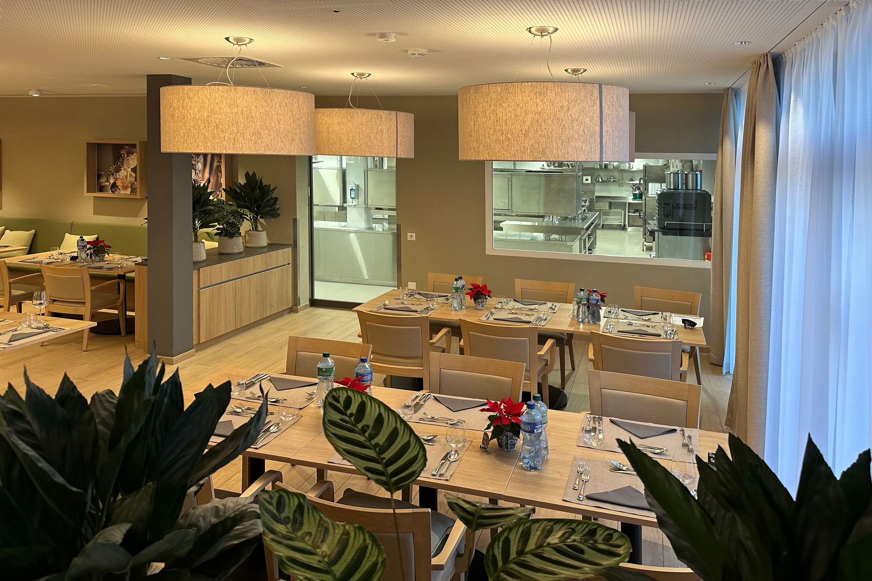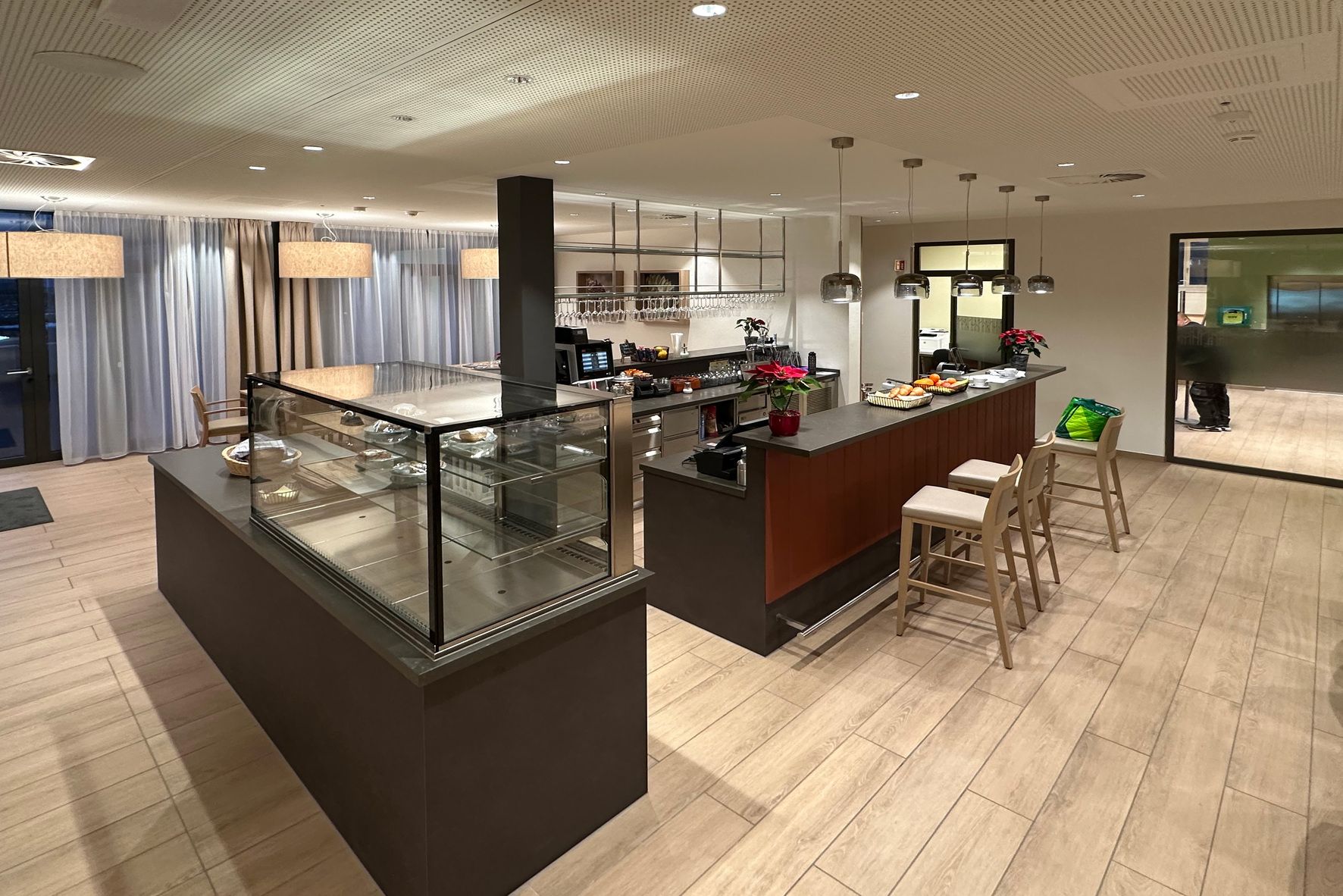 Durch die kompakte Umplanung entstand eine massgeschneiderte Verpflegungsinfrastruktur. Der ansprechende Gastraum wird durch eine attraktive Bar ergänzt. Ein zusätzliches Highlight ist das Fenster, welches den Gästen einen Einblick in das Geschehen in der Küche gewährt.